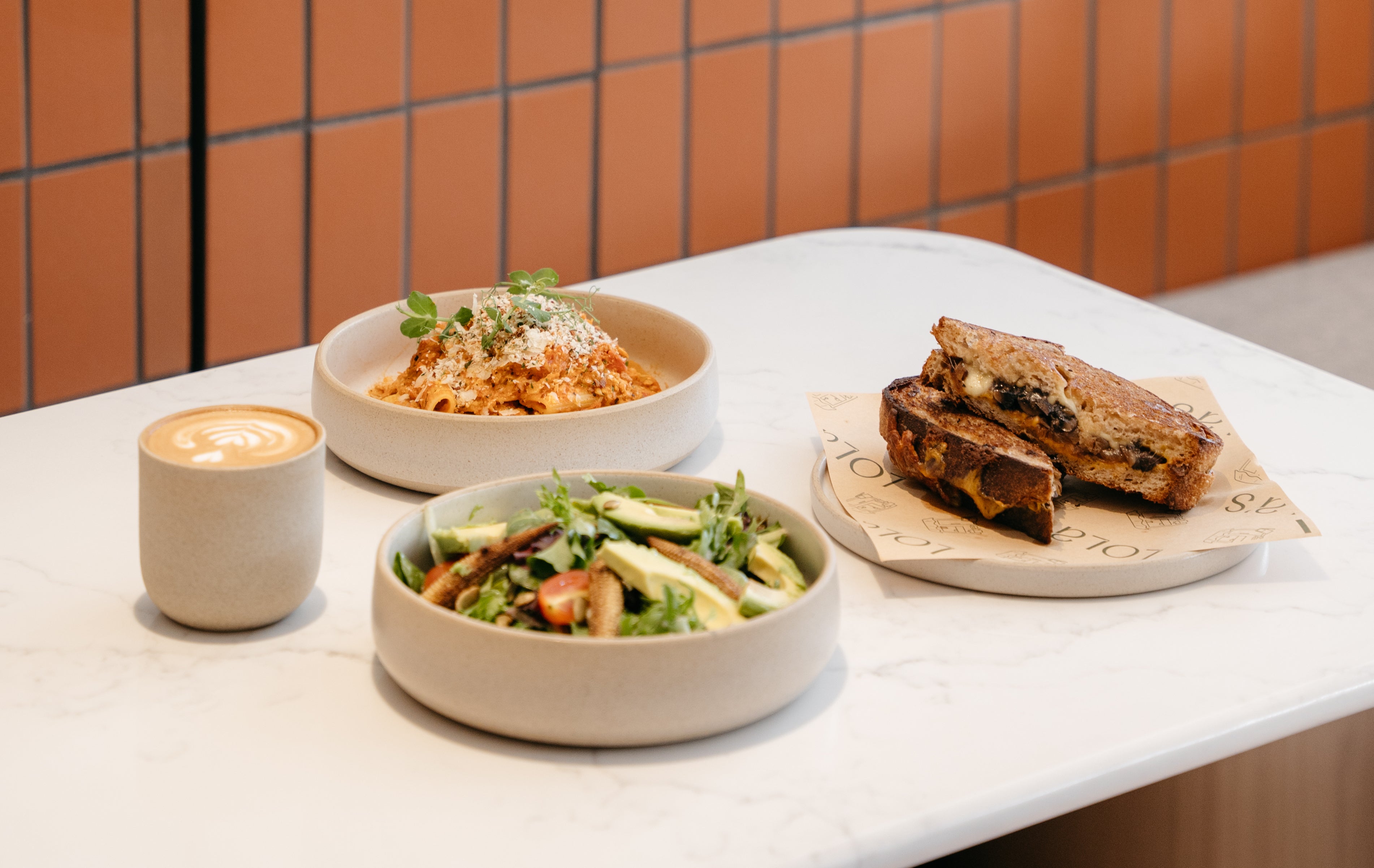 - Lola's Salad Mesclun, Avocado, Cherry Tomato, Pumpkin Seed, Sauteed Baby Corn, Roasted Sesame Dressing$14.90